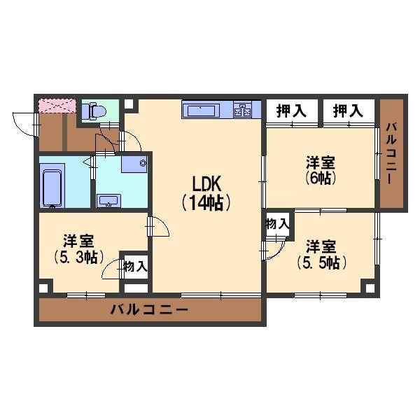 ネット無料。14帖のゆとりある3LDKのお部屋です。